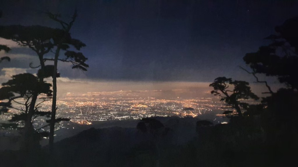 上到稜線頓時天地大開,左一看是遠處屏東的繁燈點點 , 再轉個彎右邊卻換成台東繁燈 處處 , 半夜百岳山頭見台灣東西兩端的遠方市區燈火同時就在不遠處著實奇妙 。