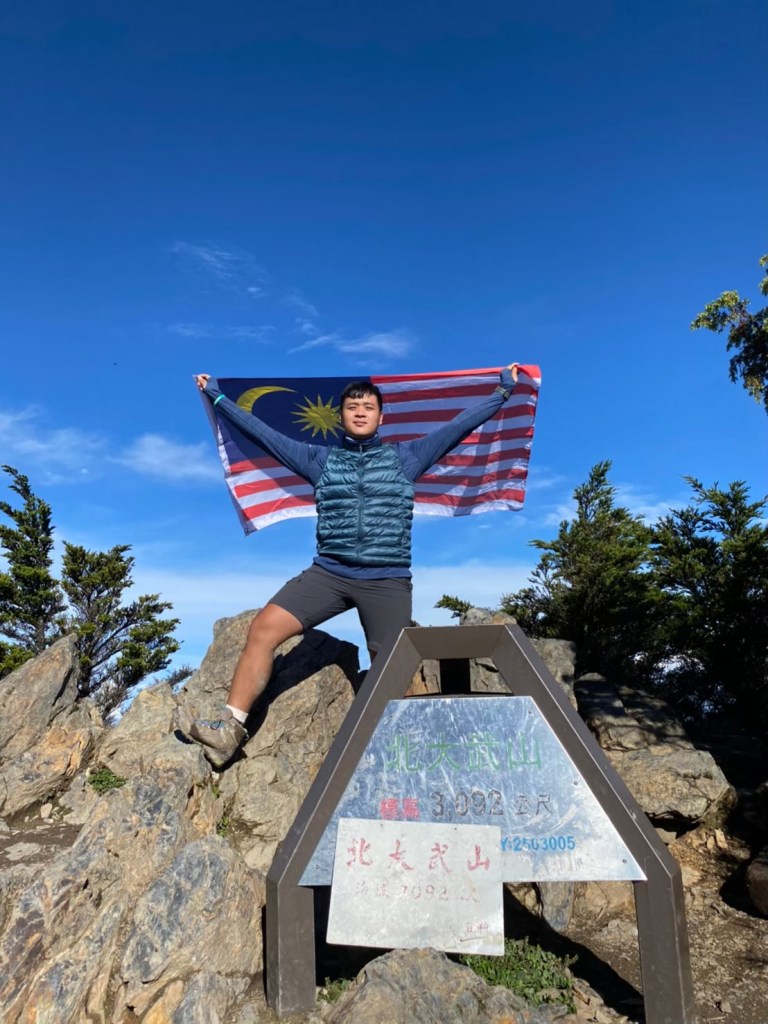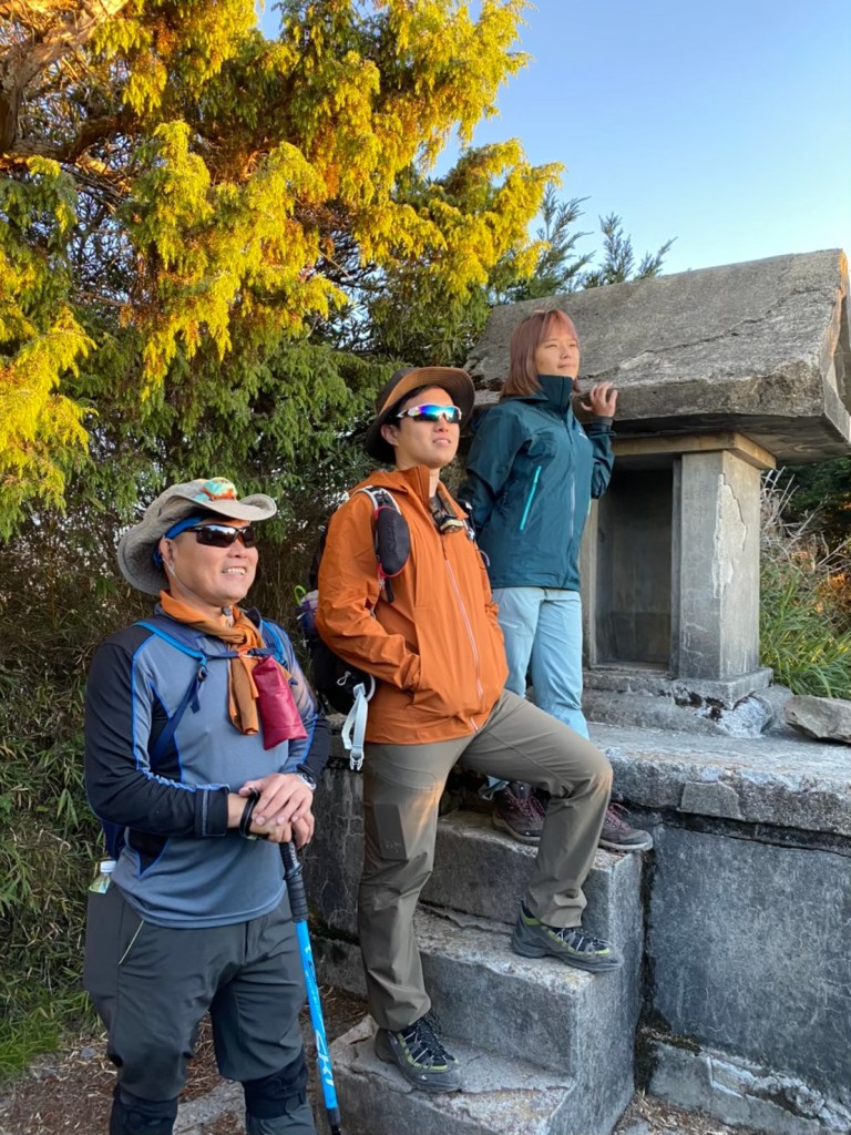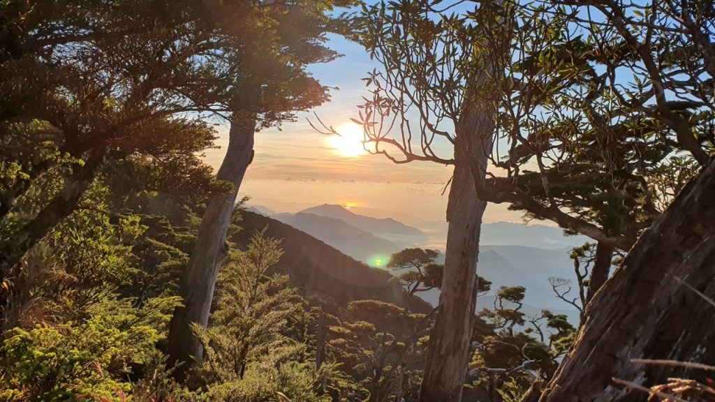 等前方鐵杉上方漸現晨曦 ,我們停住腳步在原日本神社遺址眺望著日出迎接一天的到來 。 清晨的朝陽溫柔地普照萬物 ,一路上有北大武最美最壯觀的鐵杉陪伴我們一步步地上到3092公尺的北大武三角點 。 此時天已亮視野大開這一路辛苦就得用一張張又帥又美的攻頂照來致敬自己吧 , 啾哥團攻頂必要的儀式-現沖咖啡這可是一定要的喔 。