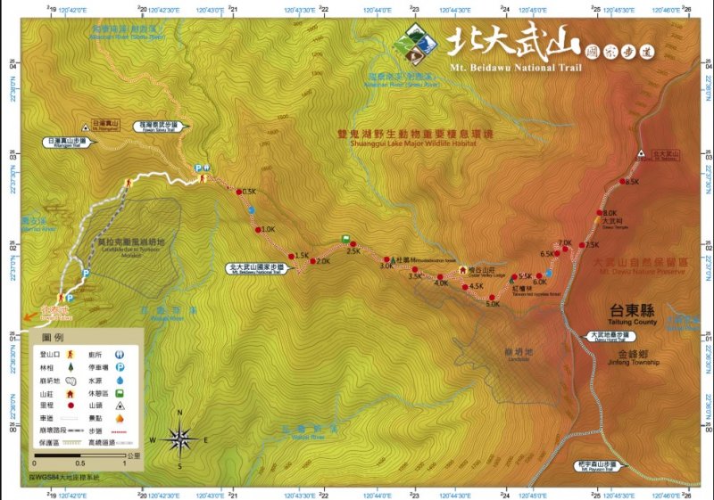 D1:新登山口 → 3.8k喜多麗斷崖 → 檜谷山莊(宿)D2:檜谷山莊 → 大武神木 → 高砂義勇軍紀念碑 → 大武祠遺址 → 北大武山三角點 → 原路折返回檜谷山莊(宿)D3:檜谷山莊 → 3.8k喜多麗斷崖 → 新登山口