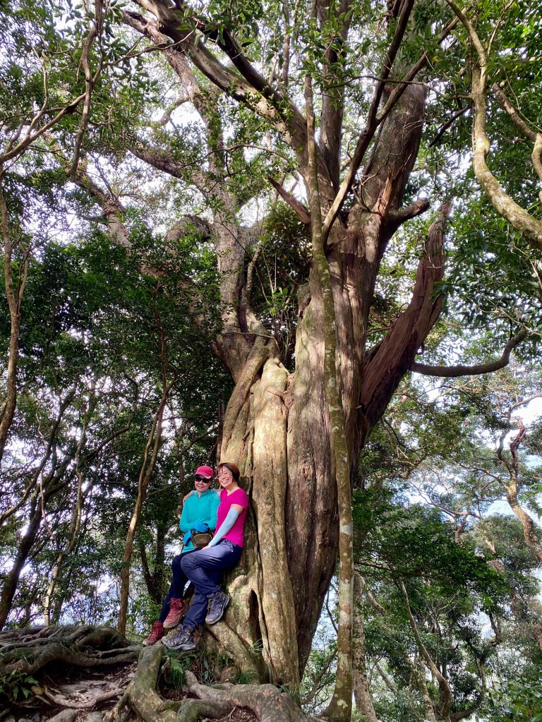 水龍頭鞍部真的有水龍頭啦,所以在這就要保握機會多補充點檜木林過濾出來的純淨甘甜的水 。 其實旁邊真的有顆和闊葉樹杜英互相纏繞一起的檜木很特別 , 這也是表示從這起 , 我們正走入雲霧帶檜木鐵杉等針葉林的國度了 。