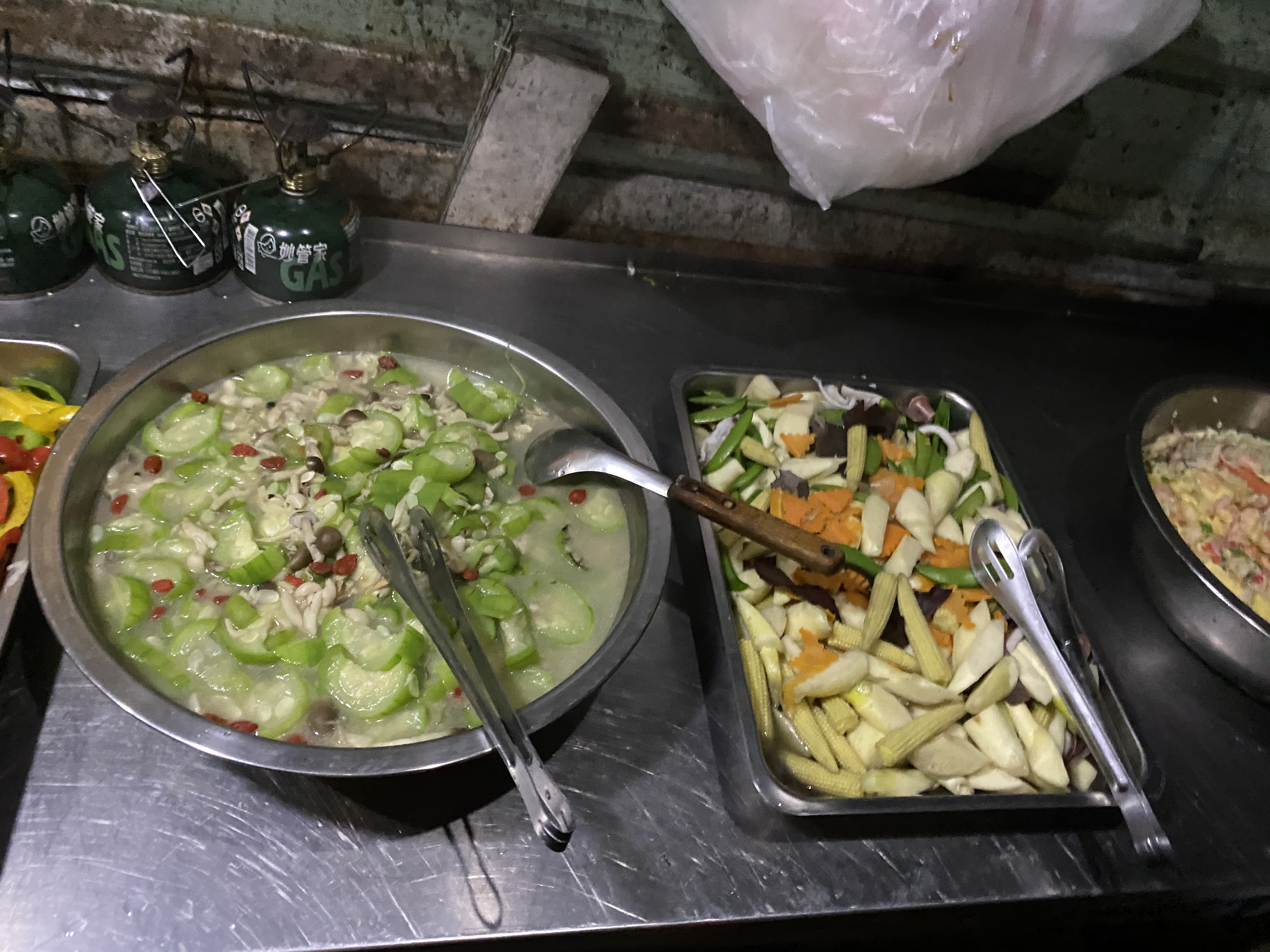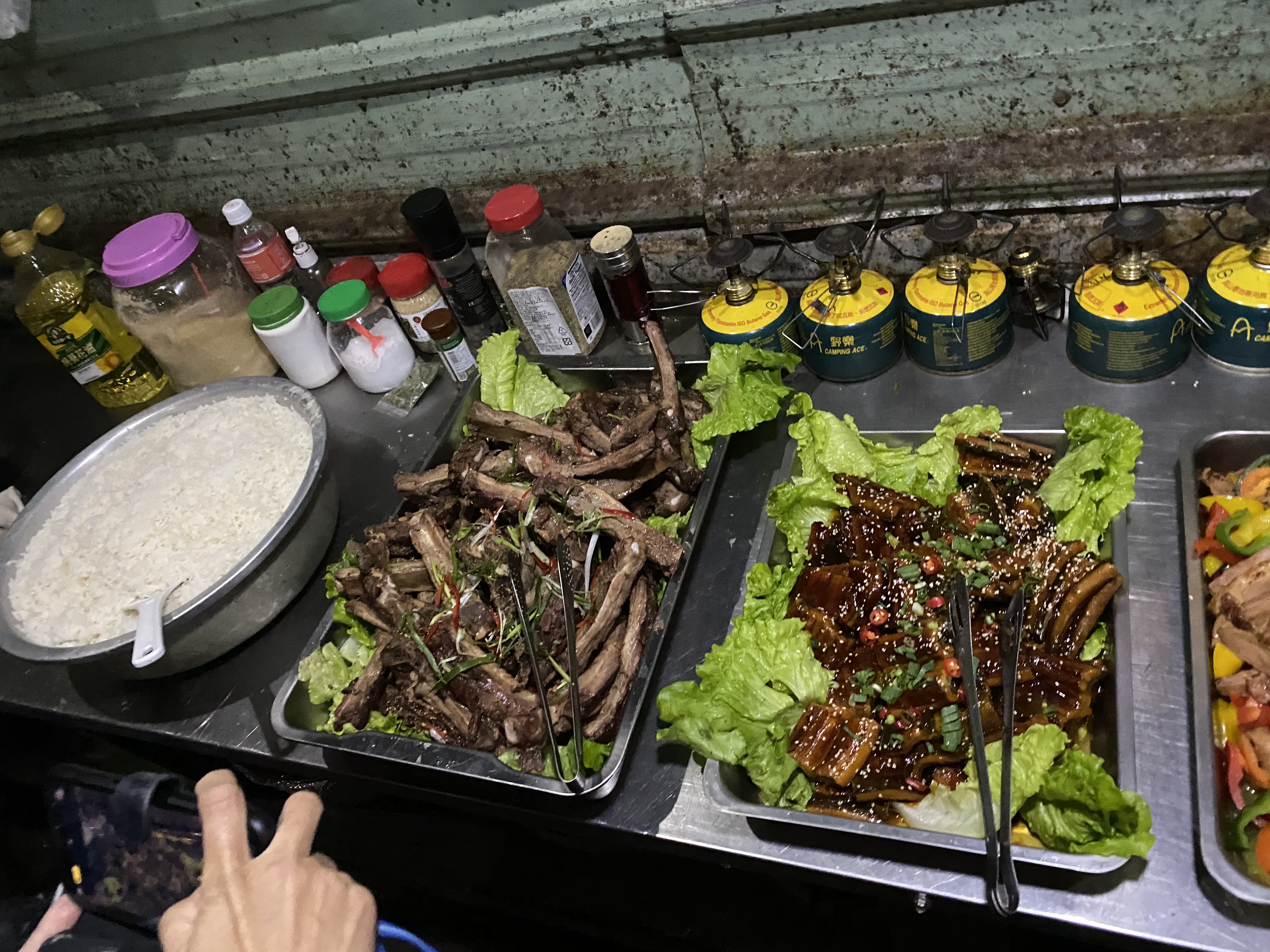 離開光明頂 , 一下即到達檜谷山莊 (真的一下子啦) 。 這也提供很棒的營位給大家選擇可 不輸山屋床位喔 。 這次幫隊員訂餐 , 果然每個人被豐盛的菜色嚇到馬上流口水哈~ 乖乖,連豬肋排(一人一大根喔)浦燒魚小卷櫻花蝦都出來了 ,連水果還有紅白葡萄耶 。 真的是屏東最棒的小吃在檜谷山莊 , 一位隊友忍不住地說~~