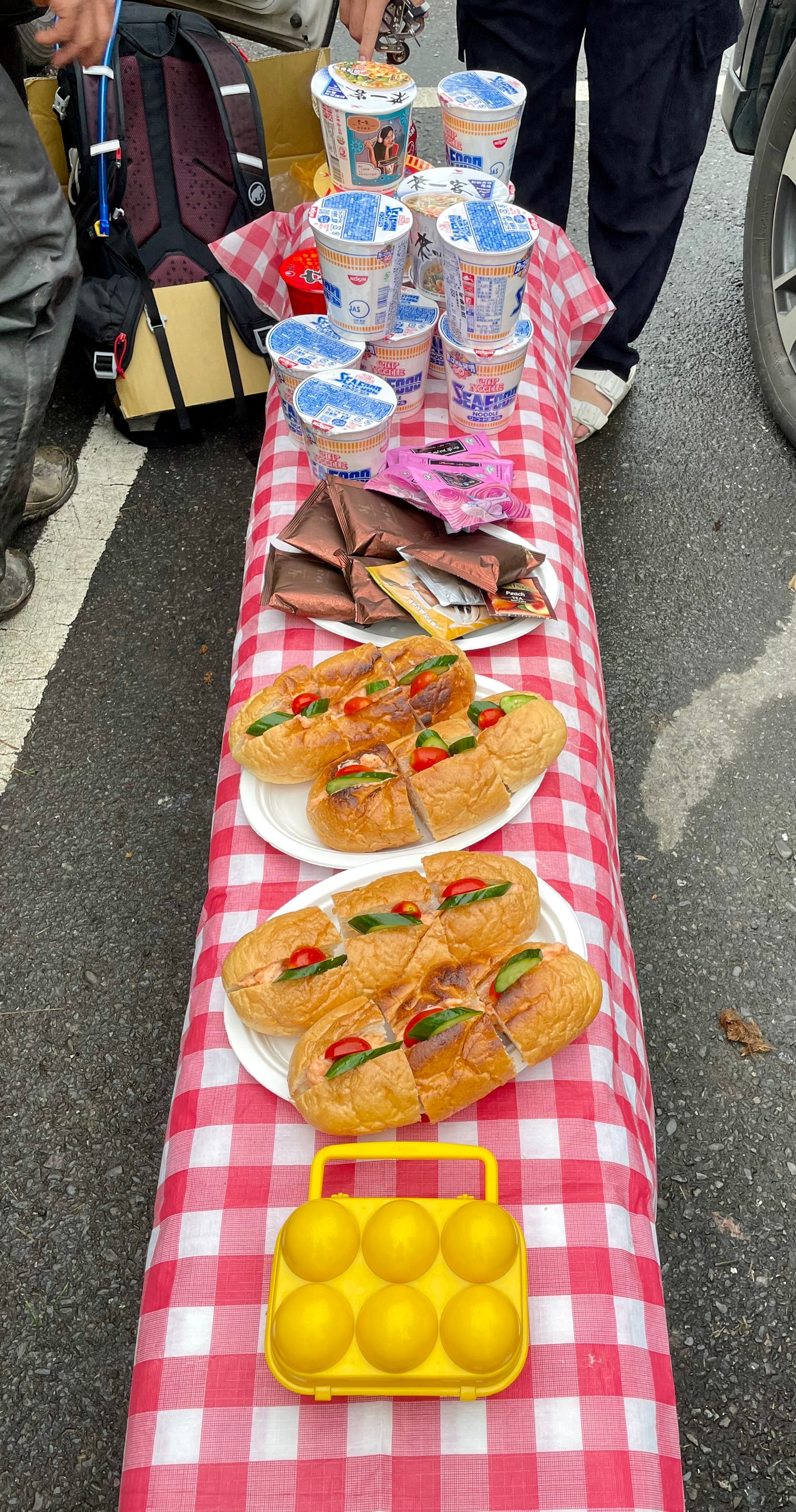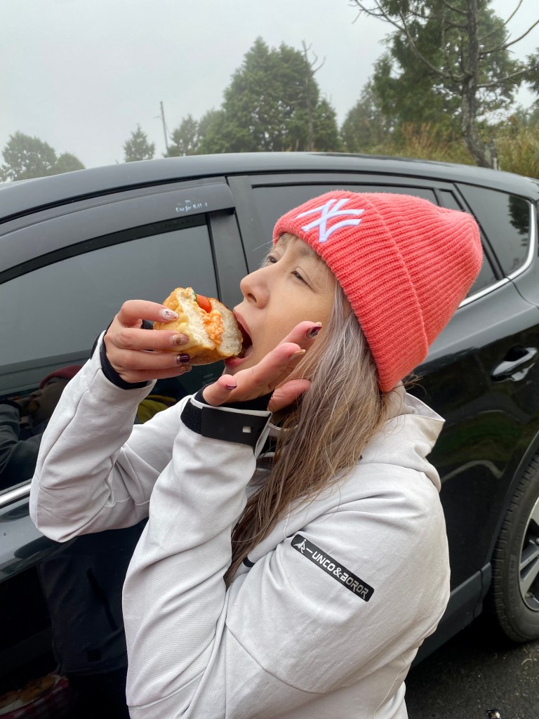 一回到我們又別於一般九座,更加的舒適的大T高頂保姆專車, 立馬擺上野餐墊,幫大家沖了熱騰騰的泡麵,在這溼冷的天氣有什麼比這一碗泡麵還美味呢? 生哥悄悄拿出令人wow wow的法式麵包佐龍蝦(醬)再搭配啾哥特選的精品現沖咖啡,果然哥倆好的搭配是如此令人意外有驚喜到,哈哈~