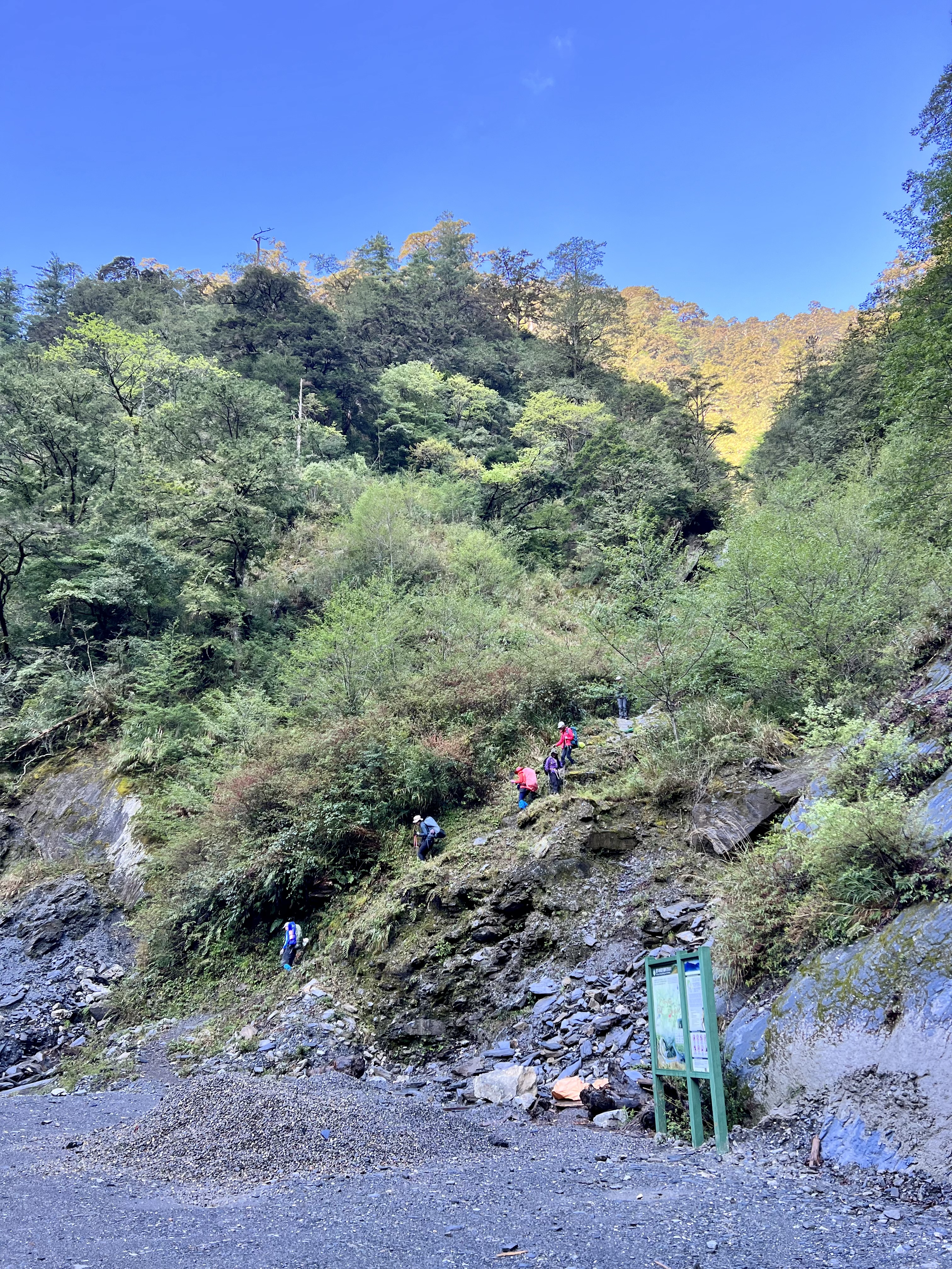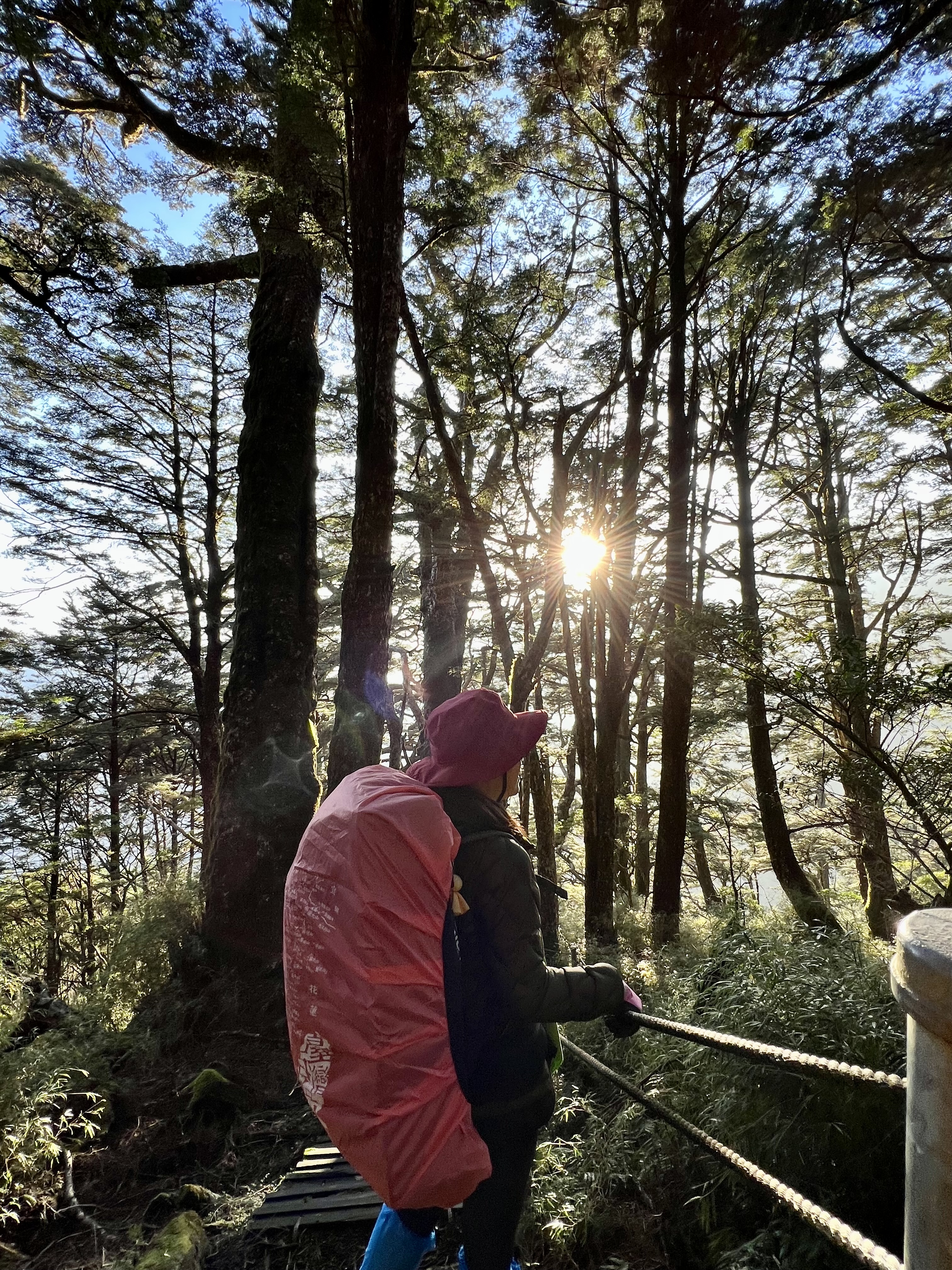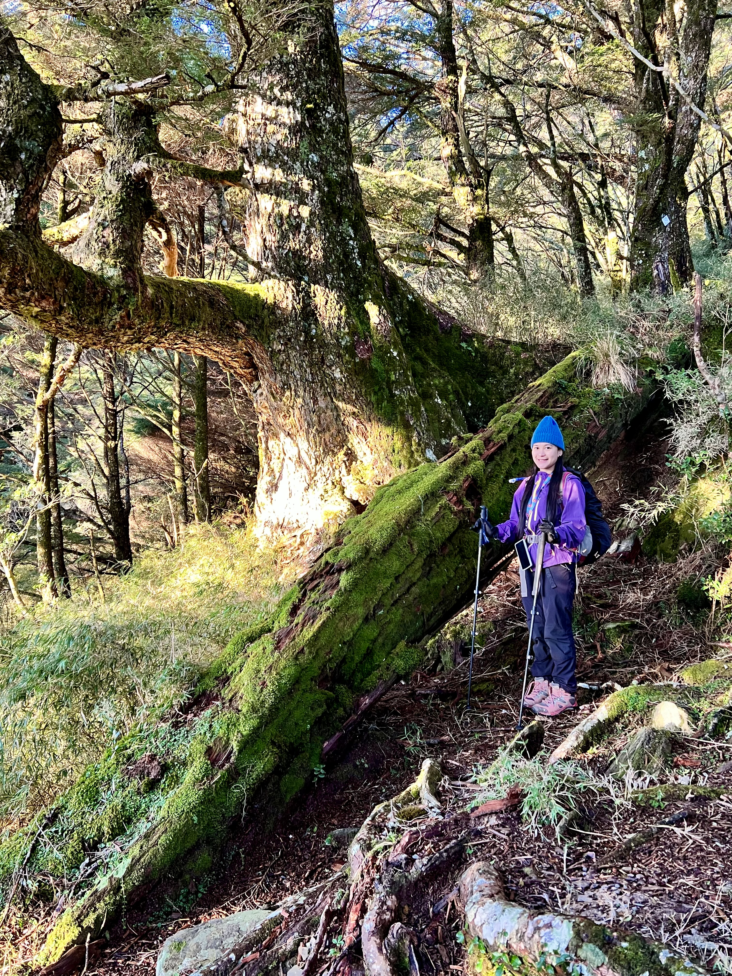 清晨在透射日出的光線陪伴下,在充滿生命力的巨大鐵杉林護送下,我們漫步下了山,大夥即興地坐在已經中斷20年的道路上,天空是如此的藍,空氣是如此清新~