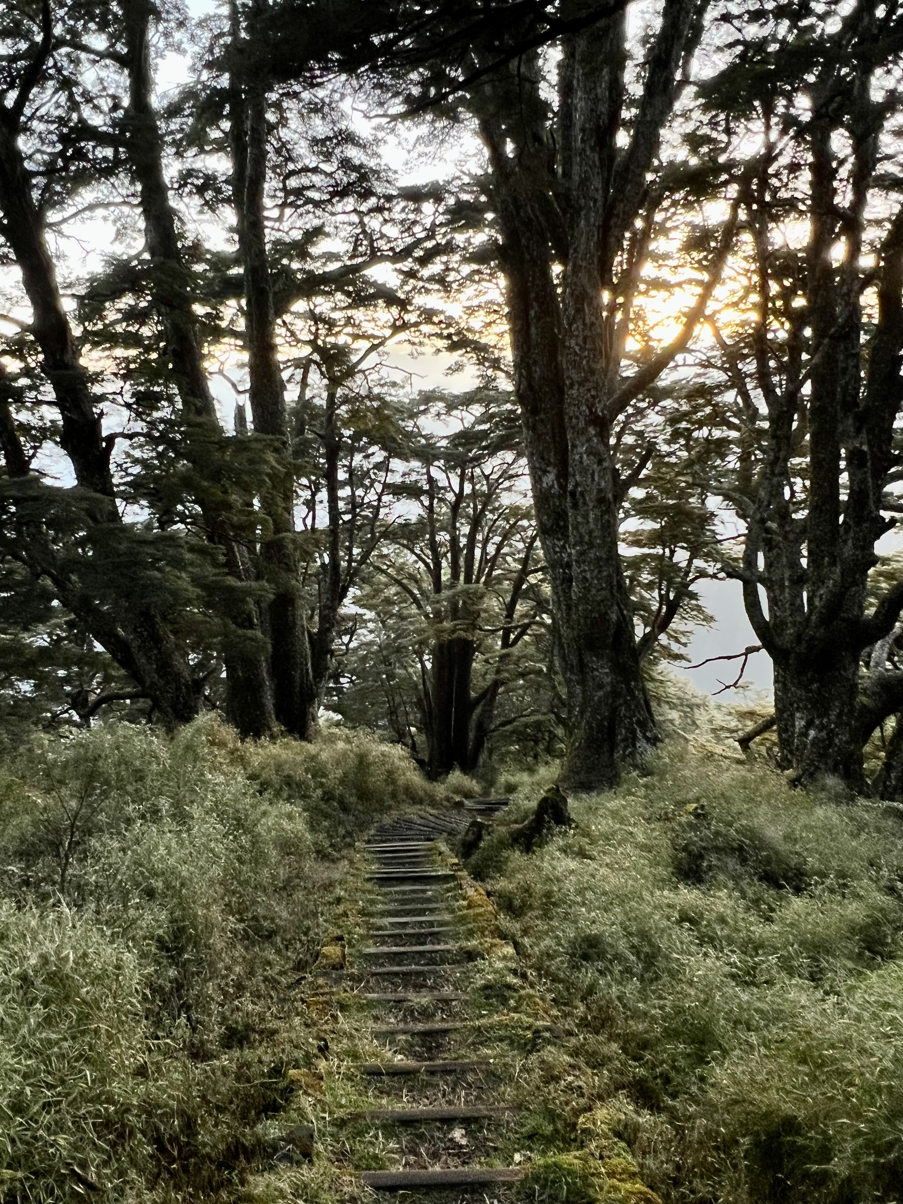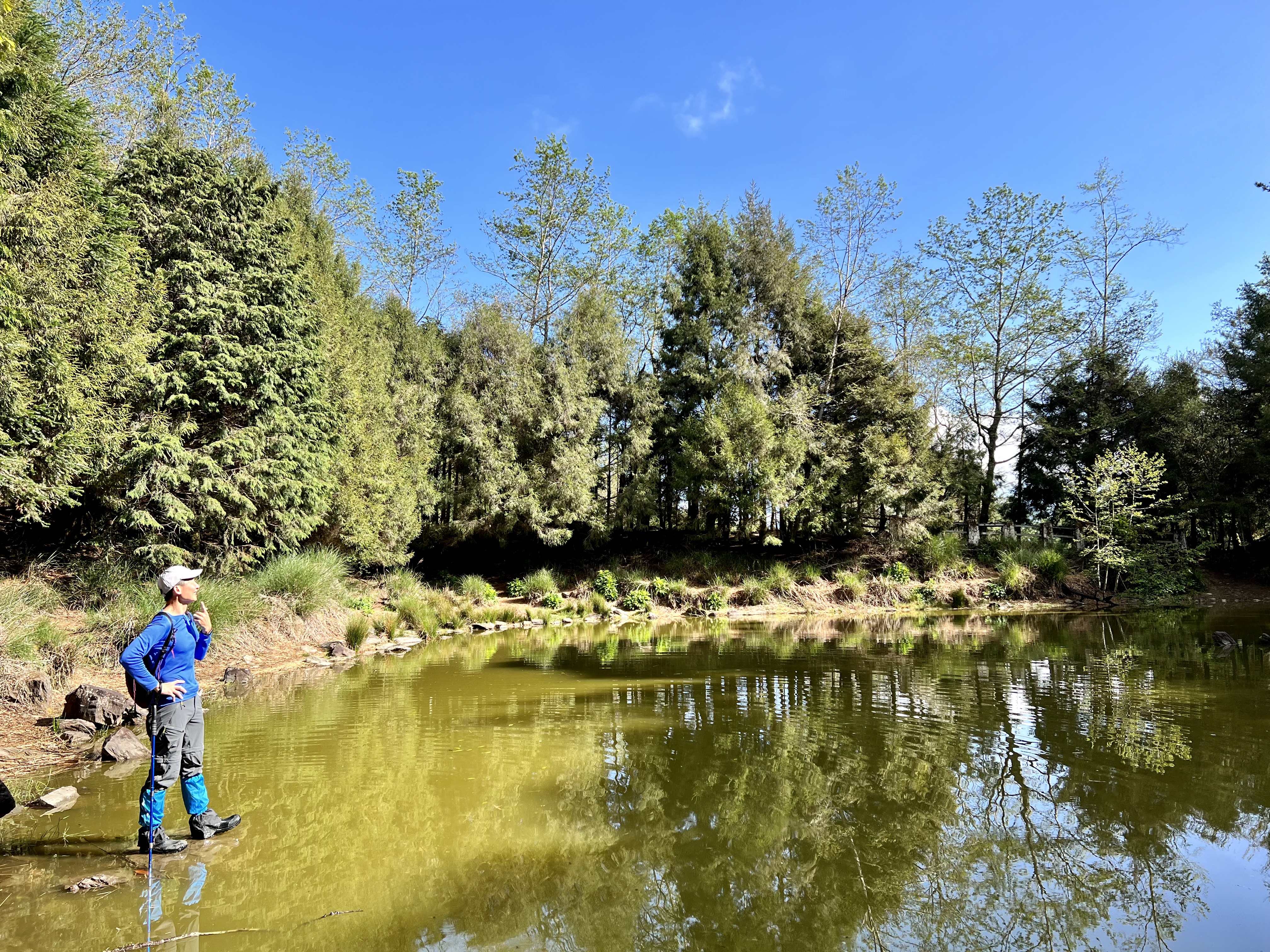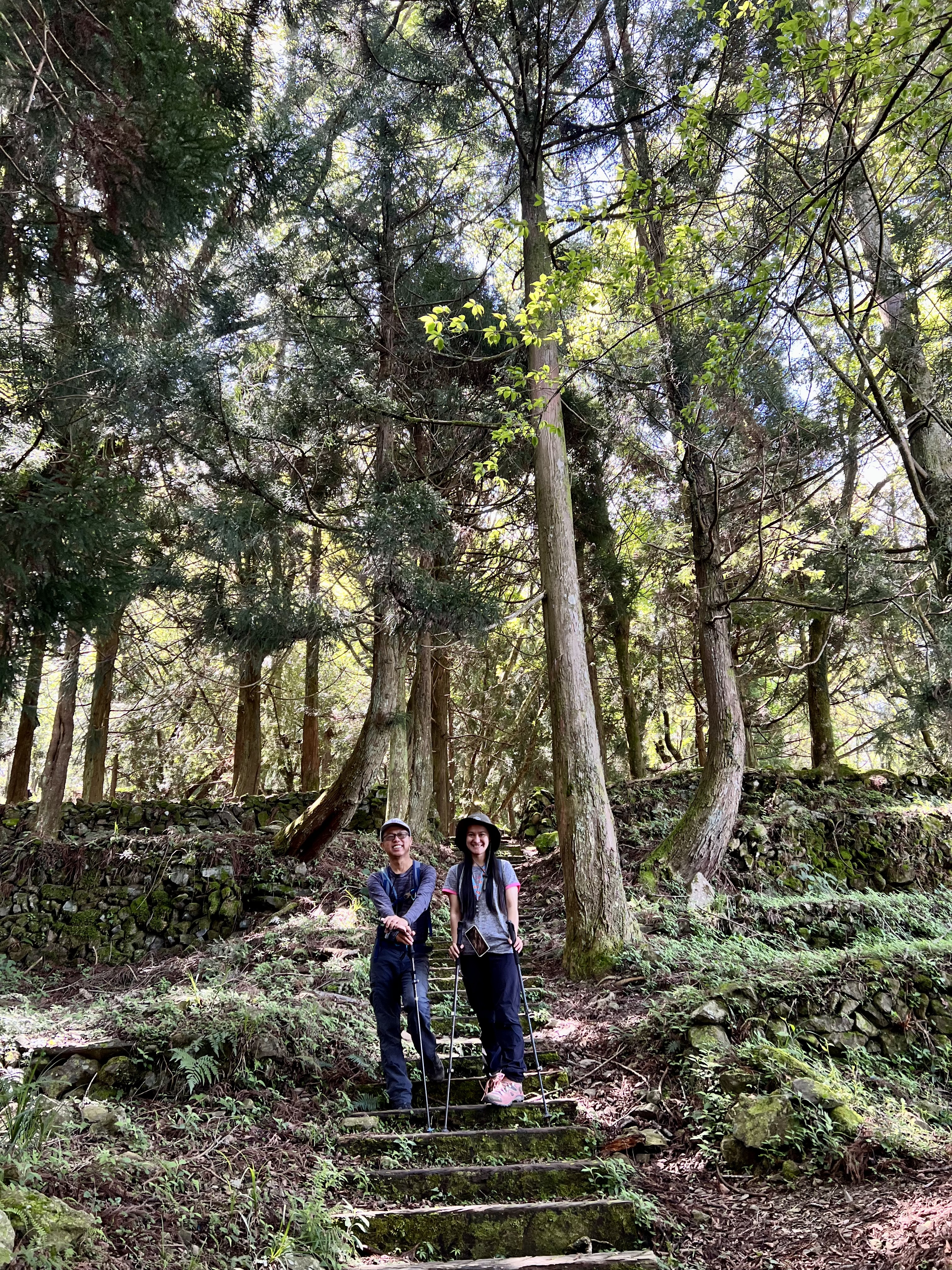 清晨在透射日出的光線陪伴下,在充滿生命力的巨大鐵杉林護送下,我們漫步下了山,大夥即興地坐在已經中斷20年的道路上,天空是如此的藍,空氣是如此清新~