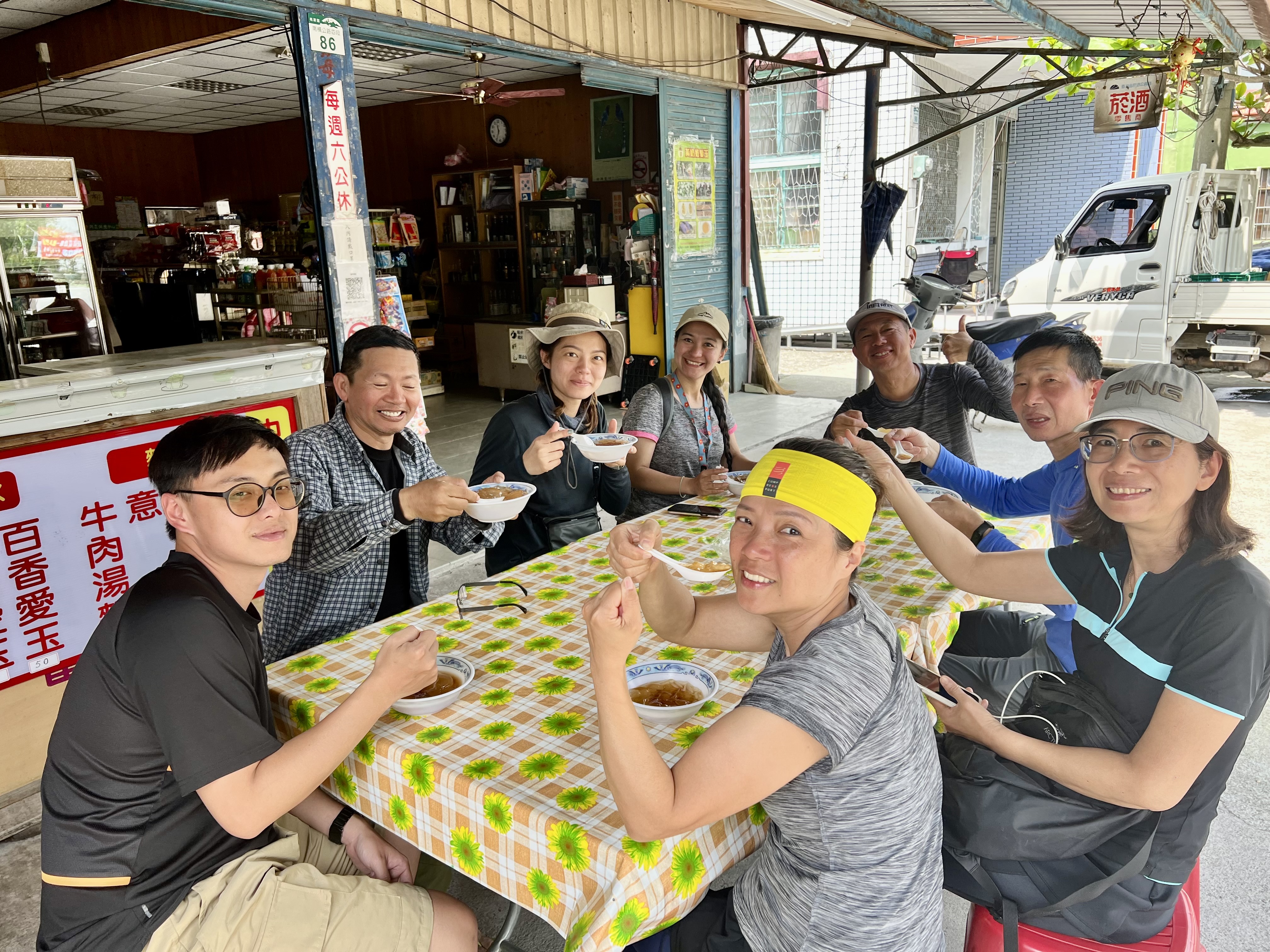 輕鬆愉快回到接駁車上,當然必須用在地的梅子愛玉先洗塵一下,再用在地的風味餐慰勞一下,然後帶大家去洗個寶來溫泉香香的回到台北![]()